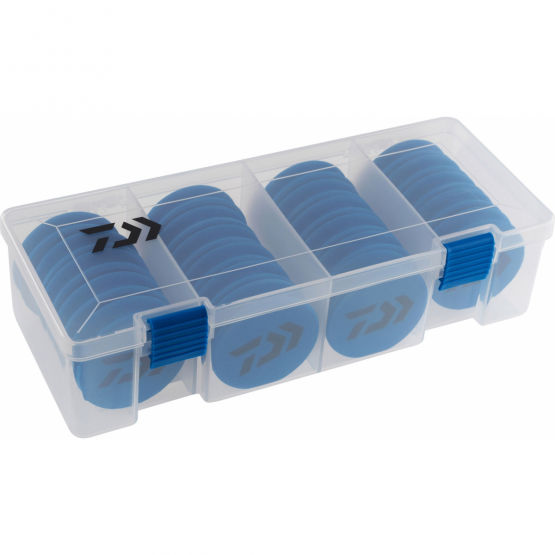 Caja porta bajos Daiwa con 22 plegadores: Esta caja es de cuatro compartimentos contiene 22 plegadores de espuma EVA de 65mm de diámetro y 17,5mm de espesor.