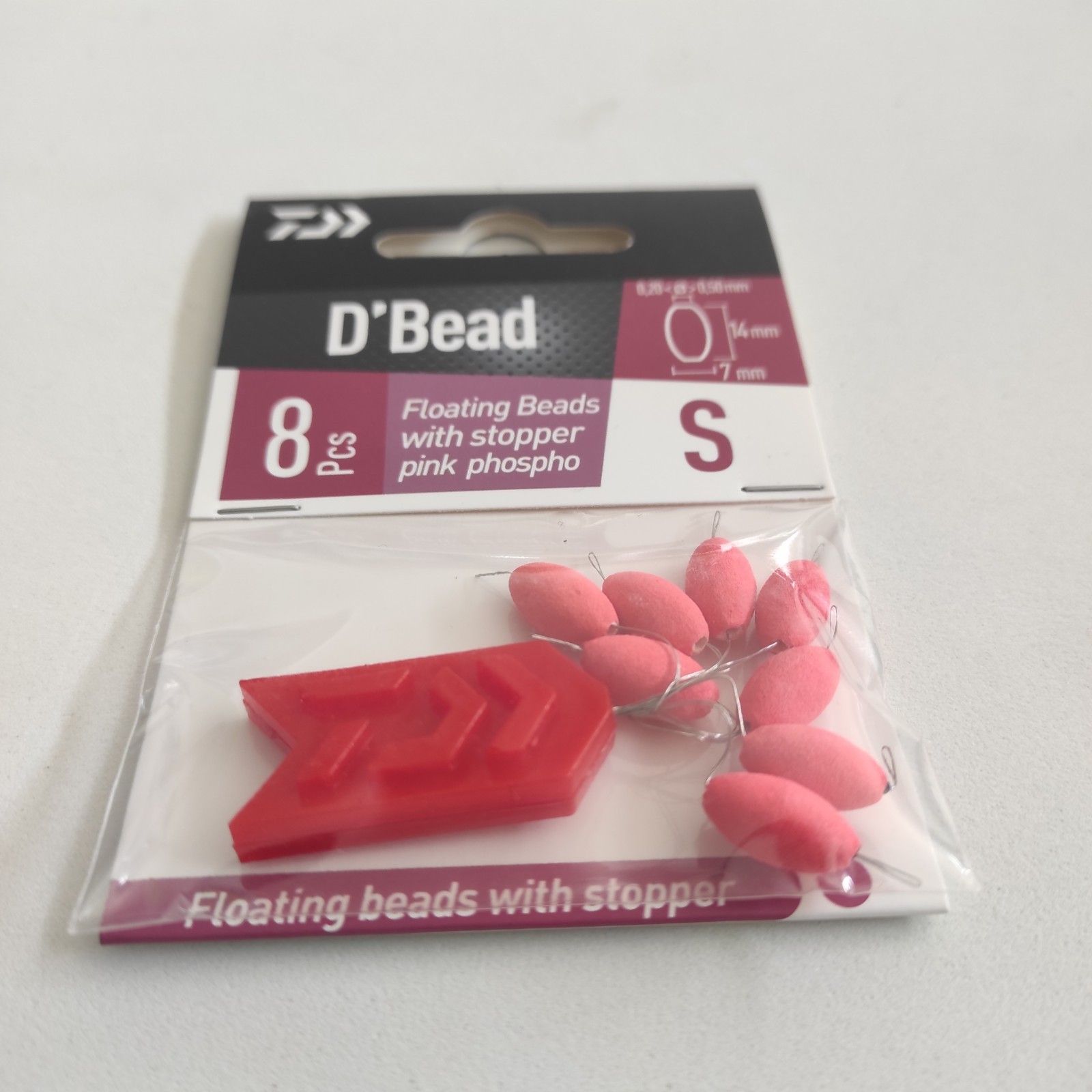 Perlas flotantes rosas Daiwa con medidas de 14×7 y 50mm de hueco para la cameta. Contiene 8 boyas con tope.
