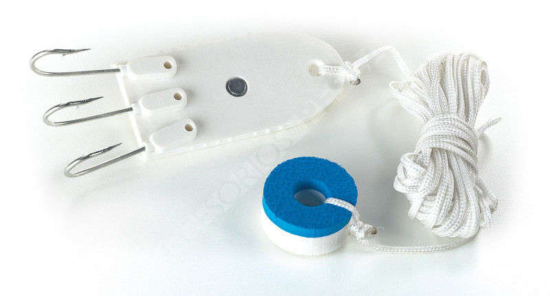 Viene provista de 25 metros de cuerda de trenzado y un corcho de goma eva en un extremo por si se nos cae al agua poder recuperarla sin problema ya que evita que la cuerda se nos hunda.
