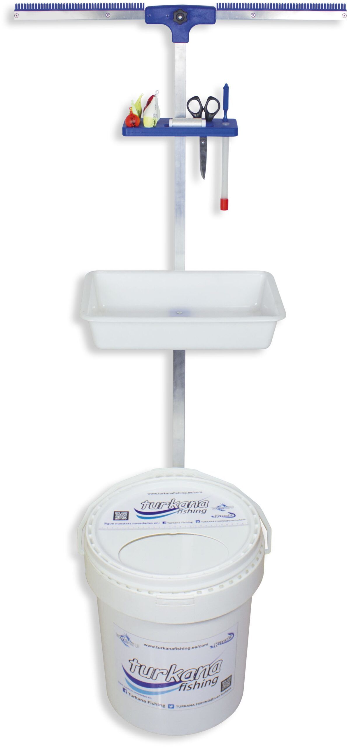 De la firma SPARUS nos traen esta novedad que consiste en una practica percha porta bajos doble, con cubo para los peces incorporado, y provista de 1 bandejas y soporte para los plomos y demás utensilios para la pesca.
